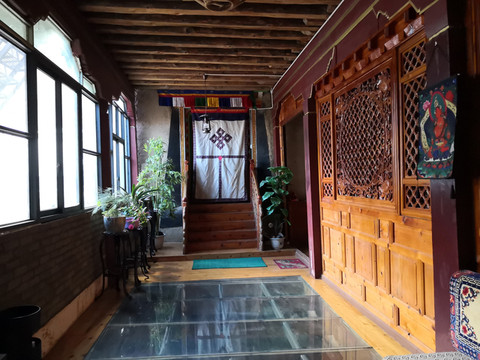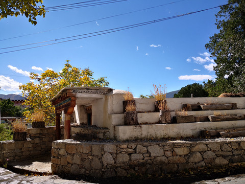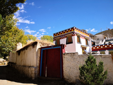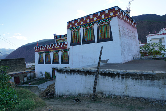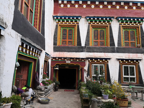 新龙民居与之前看到的藏居明显不同,底层是传统的夯土墙,整个建筑下大上小,雄壮粗犷,有特色的是他们点缀式地在二三层架设1-3间“崩科”( 在藏语里,“崩”是指木头架起来的意思,“科”指房子,“崩科”就是用木头架起来的房子。),在门楣、窗框精心雕刻着吉祥图案,用不同的色彩进行着色。
