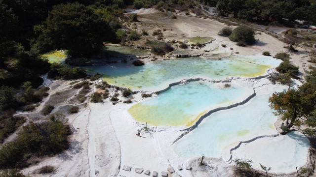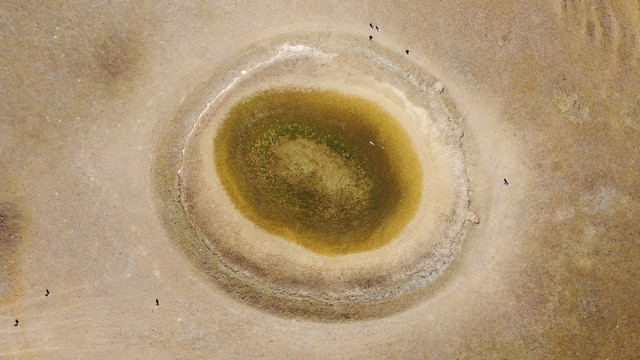 艾肯泉:从国道315进去没多远就都是土路,整体都比较平直,一个多小时可以抵达艾肯泉。艾肯泉直径有10多米,看标识牌,它还是响泉,人声越大泉水越大。泉眼如同沸腾的开水,不断翻滚上涌,泉眼周围硫磺矿物长期沉淀,色彩斑斓。从空中俯瞰,泉眼与喷涌而出的泉水及周围土地深红色环带状的沉淀物,组成了一个奇特的瞳孔造型,仿佛一只镶嵌在大地上的眼镜,所以大家都称为“大地之眼”、“恶魔之眼”。