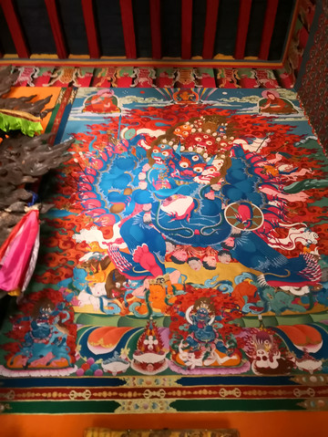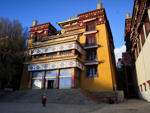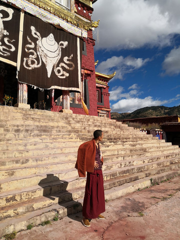 日拉寺,外墙红蓝白相间,属于萨迦教派。寺院喇嘛带领我们参观,他在这里已经学习3年,瘦高身材长相俊秀。