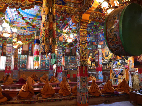 安顿好,看着天空湛蓝,去理塘长青春科尔寺看看。金碧辉煌的寺院,四周绚丽的壁画在夕阳的照射下泛着金亮的光彩。