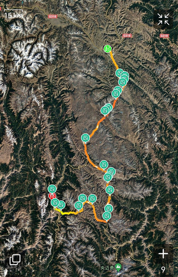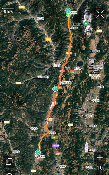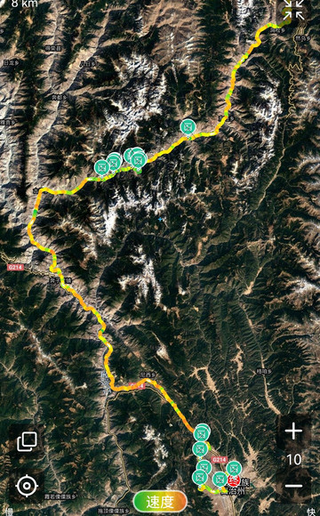 出四川乡城县向东南出发,走一段约百公里地图上尚未命名的大裂谷(路边临时牌Z001),行程257公里。
