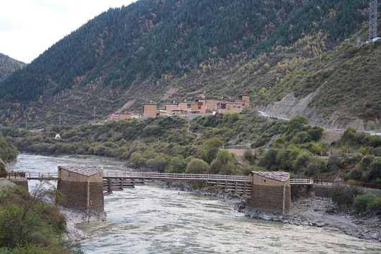这是新龙波日桥,始建于清朝,桥墩远看形如两个坚固的碉堡,全部用圆杉木、卵石、片石相间叠砌而成。两个桥墩中部,用4—6根圆木撑成拱形,圆木长度自下而上,逐步递增,形成两个悬挑臂,然后在悬臂上架梁、铺上桥板,再装上栏杆,构成桥身。桥墩上用石片叠的“伞”形结构,便是桥亭。最为称奇的是,整座桥没有用一颗钉、一块铁,每一个结合部均用木楔连接,原始而实用。
