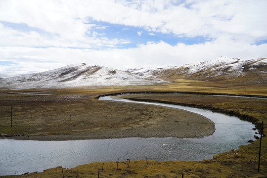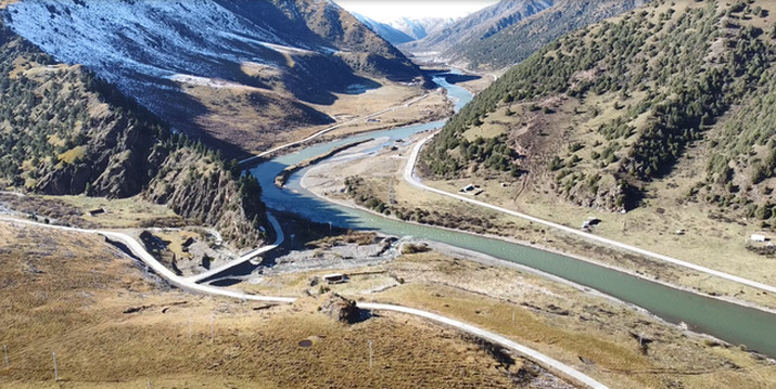 拍完格聂之眼,沿着土路下到村庄,河流从远处的雪山走来