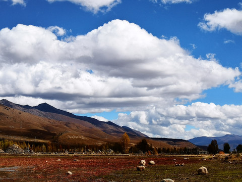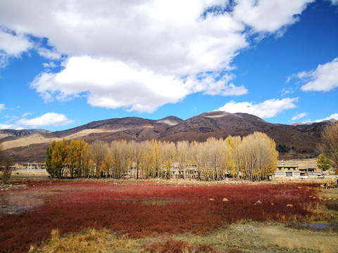 稻城桑堆的红草地,面积不大,大约仅为一到两个篮球场,红色的水草远处黄色的树叶互相衬托,成为一道独特的风景线