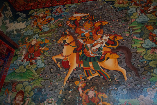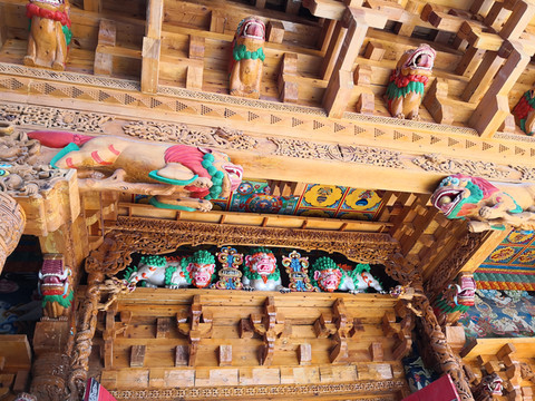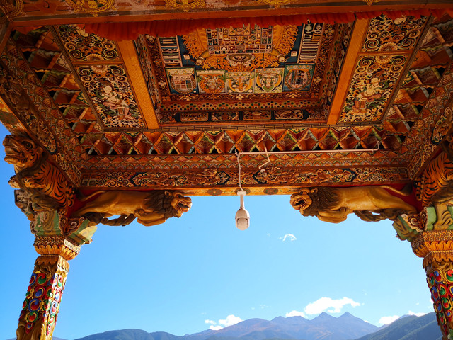 桑披岭寺,精美的雕刻、绘画作品随处可见,各类佛像、鸟兽造型千姿百态,柱头、梁坊、廊顶等处描绘着藏传佛教常见的各种吉祥图案。
