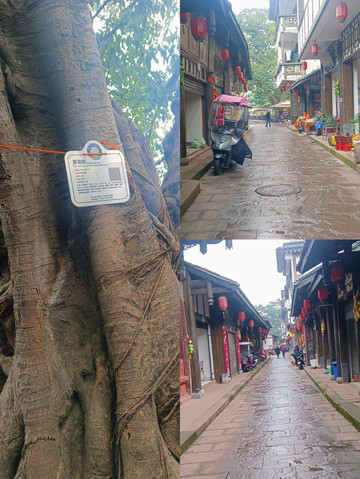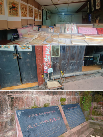 走廊尽头是老街,老街上有参天的古树,还有一些餐厅和茶馆,也有一些商铺,不是很商业的那种,主要是当地特产,比如张大千绘画御用的古法手工制作的宣纸,夹江的年画,都是当地的特色。老街是长条石石板路,建筑风格保存相对完好,可以在这里走走停停,拍拍照,看看店铺里的物品,和门口的老人们聊个3毛钱的天,问问东家长西家短的生活琐事,也算是入乡随俗,旅途乐趣。