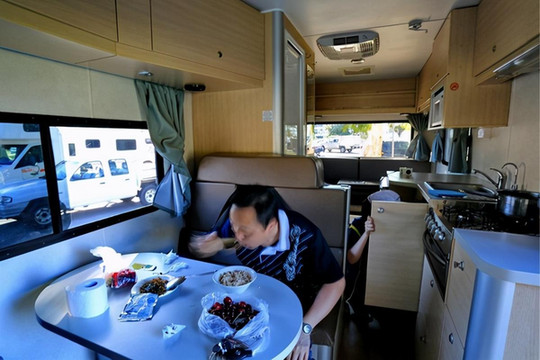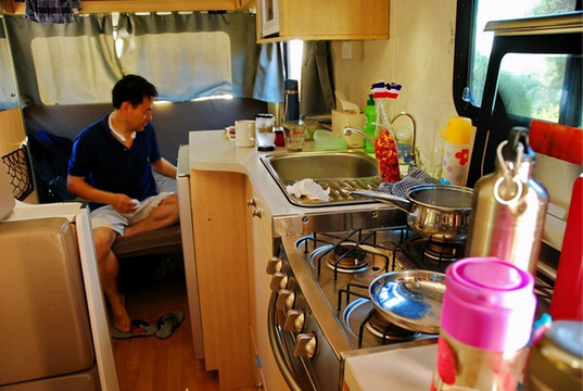 房车内部:三张床,两张餐桌,煤气灶,冰箱,微波炉,电视,4个喇叭的音响,厕所,空调,户外桌椅,洗手、洗菜池。