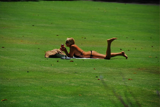 草坪上日光浴的美女