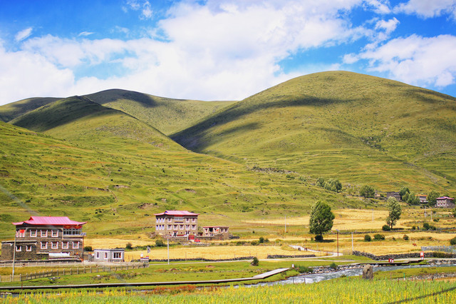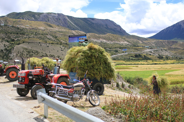 恰逢青稞收割的季节,人们在田里干活,藏民餐饮店一般只经营晚上。这里也能看到收割机,面积稍大的青稞地也是机器收割。