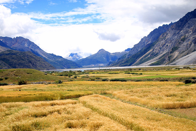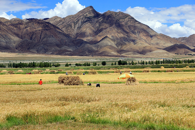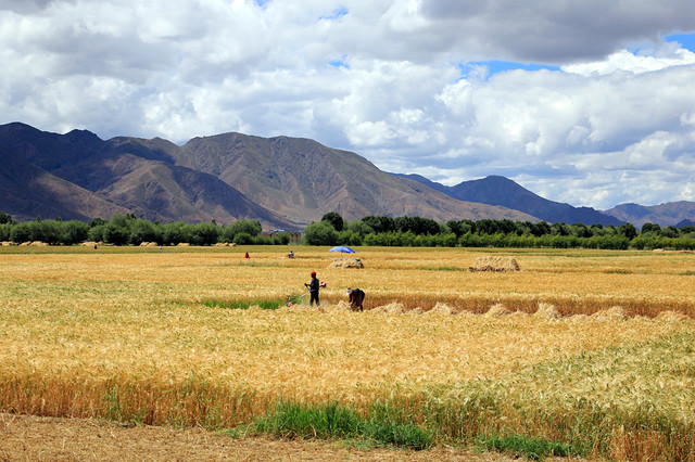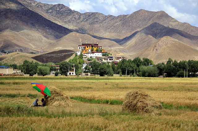 日喀则又被称作中国青稞之乡,到处都是大片大片的青稞,收获的人们午餐也在地里吃。可是这里还是人工收割,不是机器,跟在新都桥看到的不一样,满以为这里如平原面积一样的青稞会使用收割机。