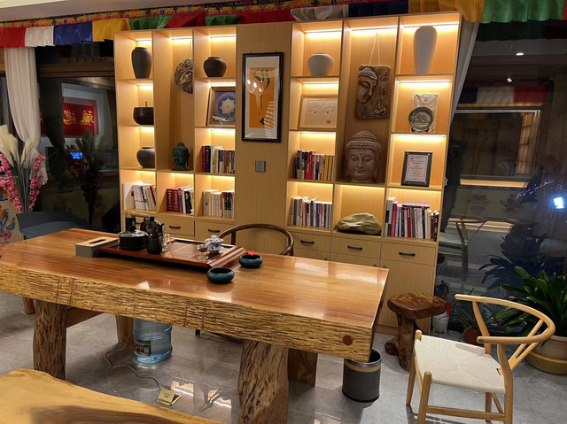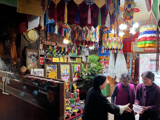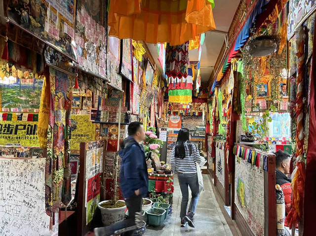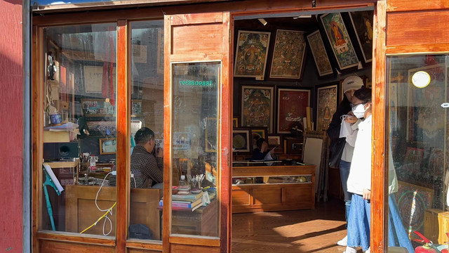 老板是一位憨厚的画师。一缕阳光穿过藏式的房檐,透过玻璃映入屋内,一半给了画布上的信仰,一半给了旁边念书的女童。这本身就是一幅安静的唐卡,陶醉在拉萨幽静的小巷。