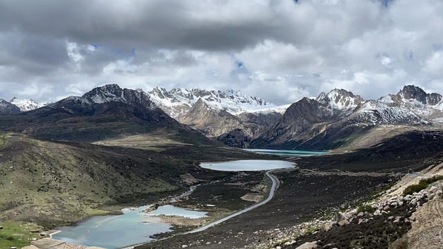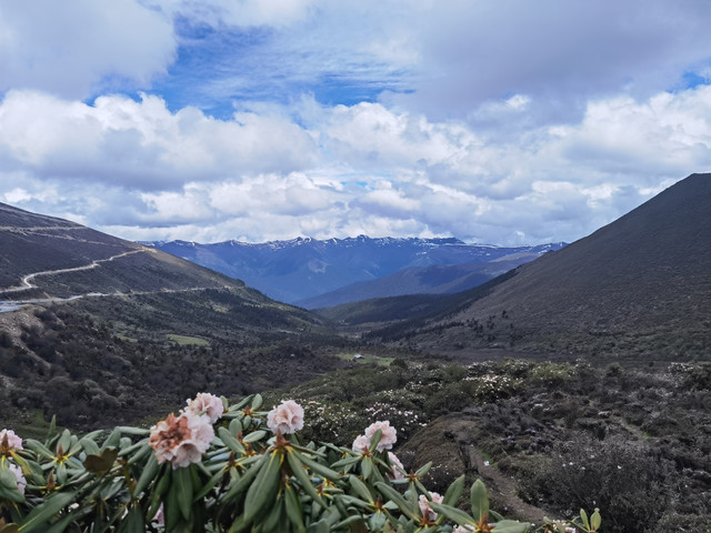 还是不远处的路边,野花野草,一望无际的河谷,层峦叠嶂的雪山,属于高原的宁静和俊美