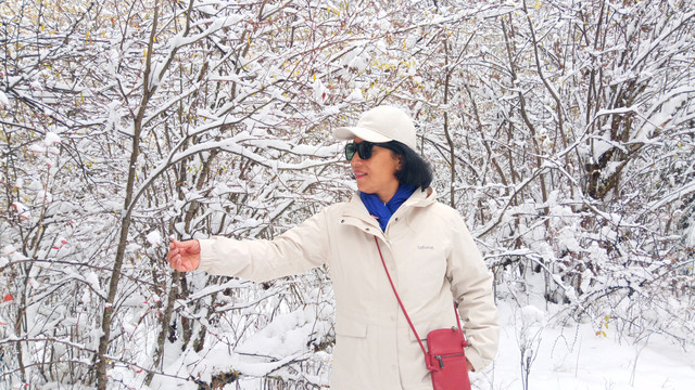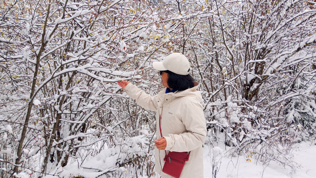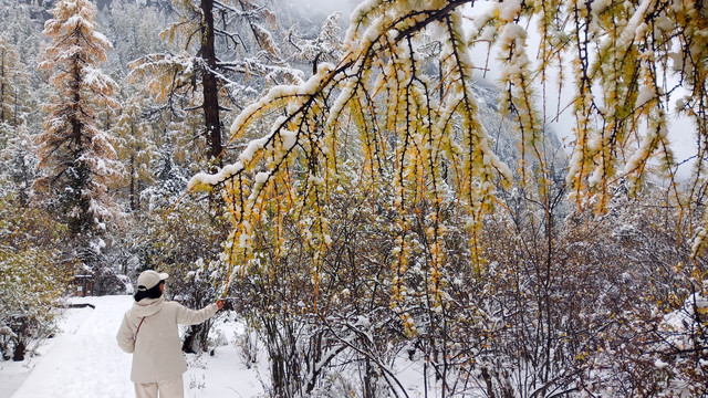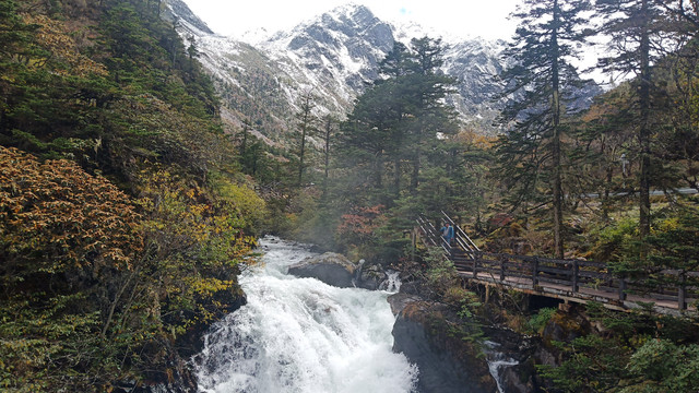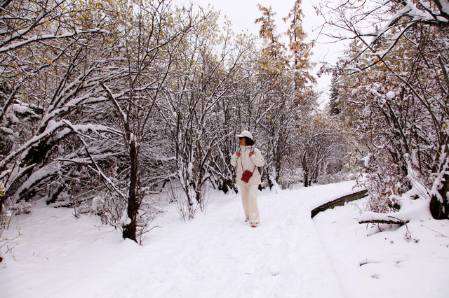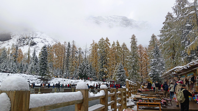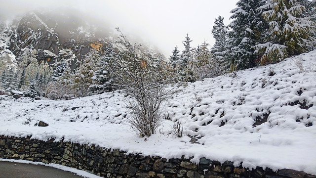 D15(10.21)一早进入双桥沟,很是幸运昨晚下雪,观光车一路向上,望着窗外漫天飞舞的雪花优雅的舞动,树枝,屋顶,栏杆,道路、岩石都被厚厚的白雪覆盖着, 云雾茫茫,雪山忽隐忽现。