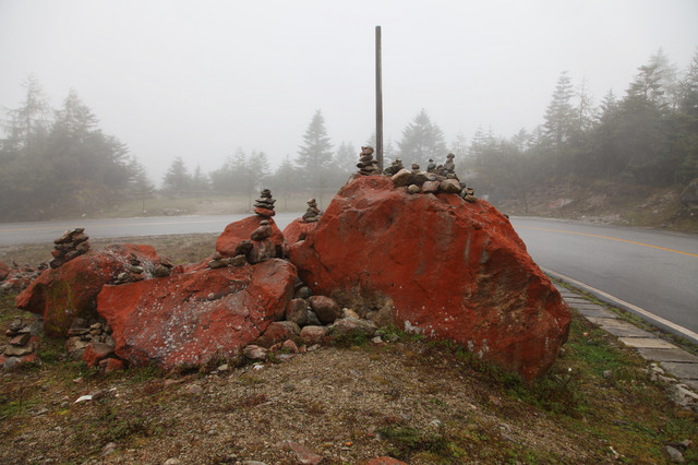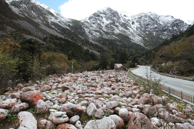因海螺沟的地震,造成了大片石头上那层覆盖的红石消亡。红石呈艳丽的铁锈红,这块算是比较完整的红色。“红石滩”石块成红色的原因,有植物学家说,是因为这里气候适合红色藓类生物生长而附着在石头上的关系,有生物学家说,是一种低等生物生长在石头上形成的,还有地质学家说,是这里的石块因特殊地形及气候原因,某种矿物含量过高所致。