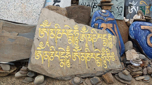 玛尼堆,是垒起来的石头之意。在西藏各地的山间、路口、湖边、江畔,几乎都可以看到一座座以石块和石板垒成的祭坛。玛尼堆也被称为“神堆”。这些石块和石板上,大都刻有六字真言、慧眼、神像造像、各种吉祥图案,它们也是藏族民间艺术家的杰作。