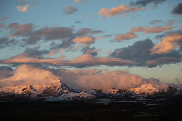 被日落的余辉眷顾到的山头雪白透亮,云层覆盖的山石显露着它本身的灰褐色,画面的立体感特强,非常漂亮。