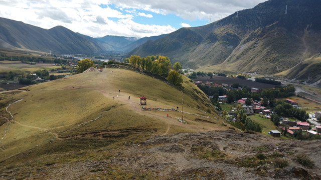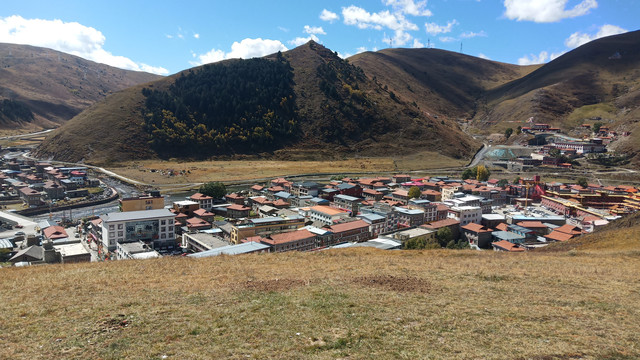 站在塔公草原的高处可以看到整个塔公镇的全貌,小镇就在山谷之间。