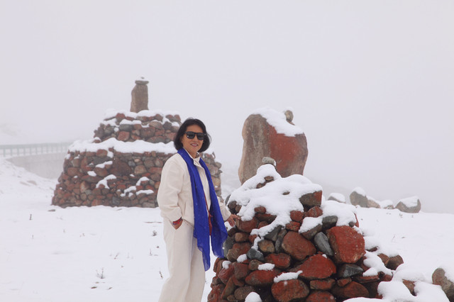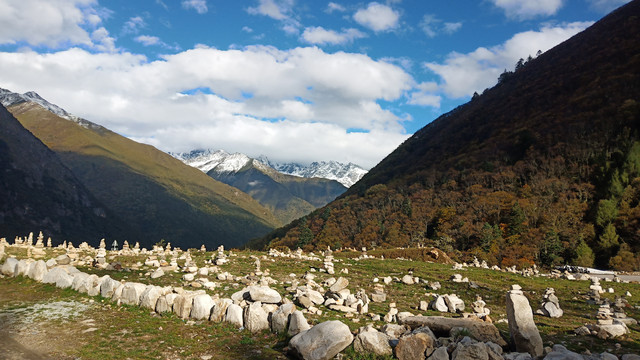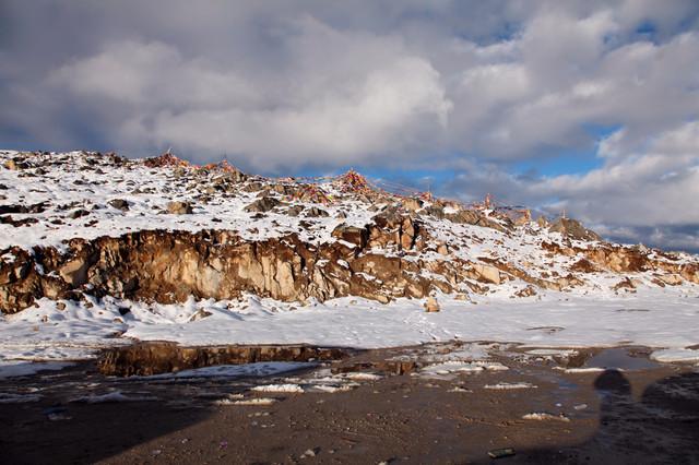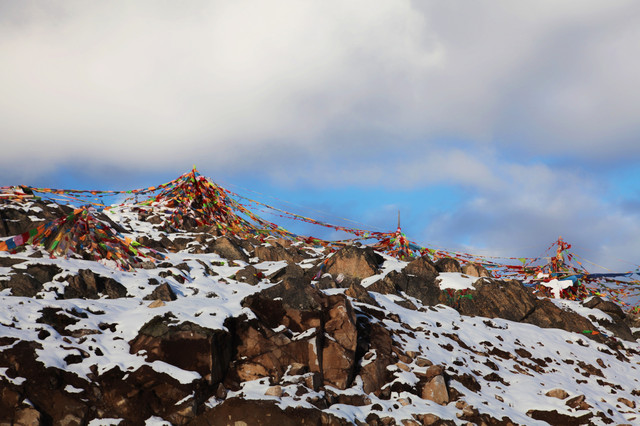 一路上都是蓝天,云层,石山,白雪,玛尼堆和经幡。