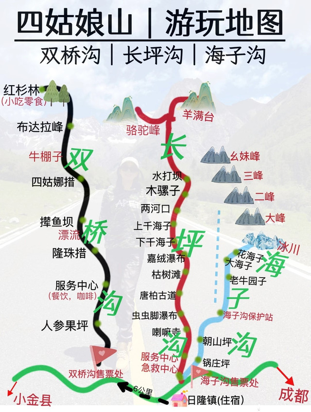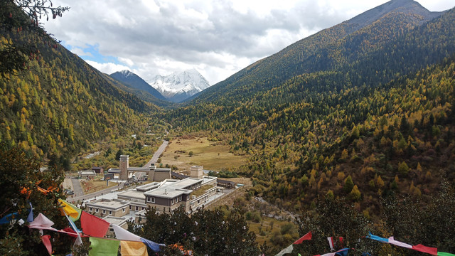 D14(10/20) 上午休整,午饭后继续出发日隆镇,四姑娘山镇落脚。四姑娘山有三条沟分别是双桥沟、长坪沟、海子沟。最省力的线路是双桥沟,巴士直接送至红衫林,然后一路向下,也可以在站点乘车,随上随下。长坪沟只是送半程,接下来就是徒步或骑马。海子沟必须全程徒步。所以看个人的情况选择适合自己的,我们选择了双桥沟。