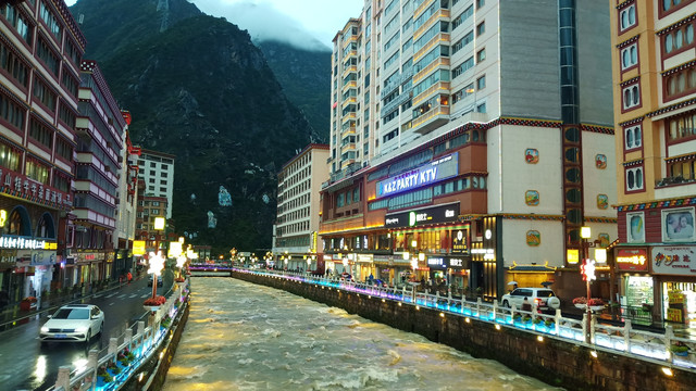 翻山越岭到达康定城。康定河将城市一分为二,水流湍急,水力资源丰富。城市也挺热闹,人流车流穿梭不息。