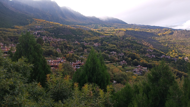 甲居藏寨可以自驾盘山而上。“甲居”,藏语是百户人家之意,整个山寨依着起伏的山势,一幢幢藏式楼房洒落在绿树丛中。或星罗棋布,或稠密集中,或在高山悬崖上,或在河坝绿茵间。