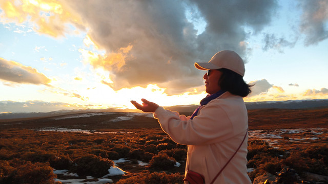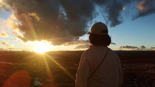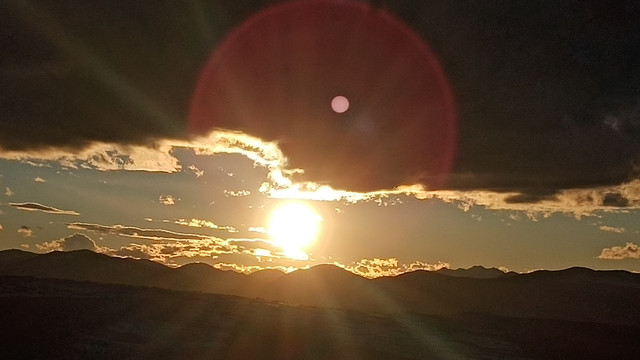 高海拔的日落就在眼前,光芒四射难以直视。曾经见过这样一段文字很喜欢,太阳未出时,全世界都像一个梦,唯有月亮是真实的。太阳出来后,全世界都真实了,唯有月亮像一个梦。