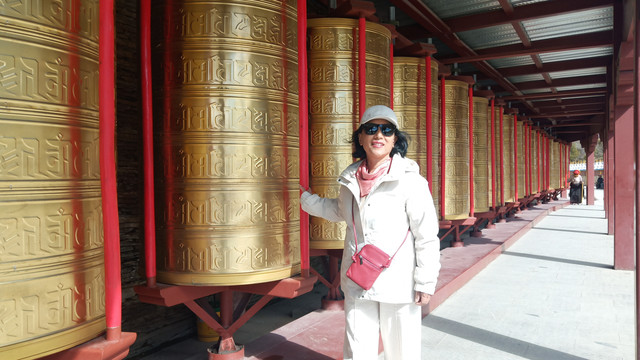 我也转一圈为自己及家人祈福,这一个转经筒的重量不知有多少,非常重。