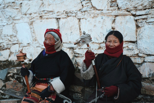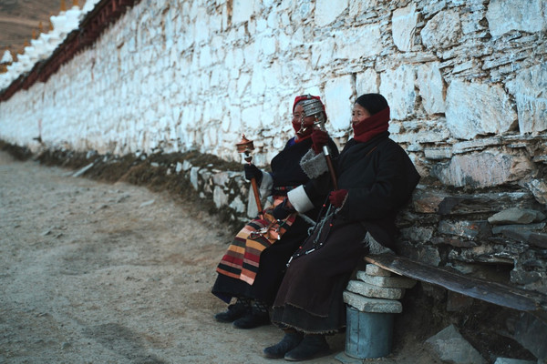 这段上山坡的路能围着寺庙转一圈,所以一路上有许多信徒陪伴,他们手上转着转经筒,嘴里念念有词,非常虔诚。