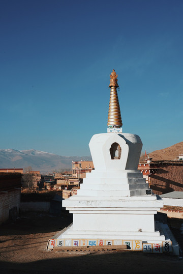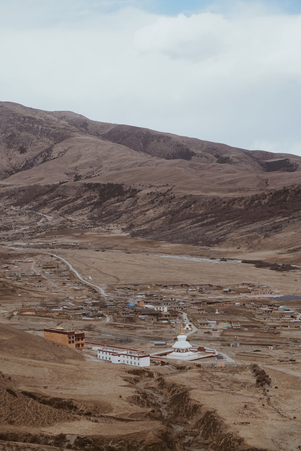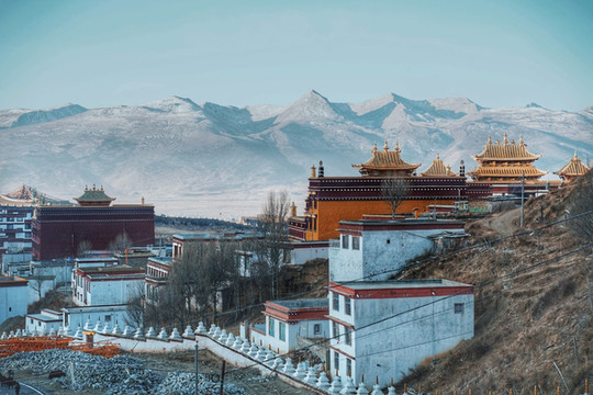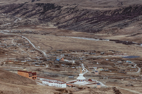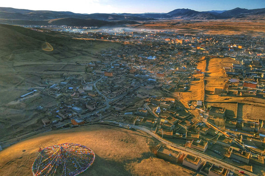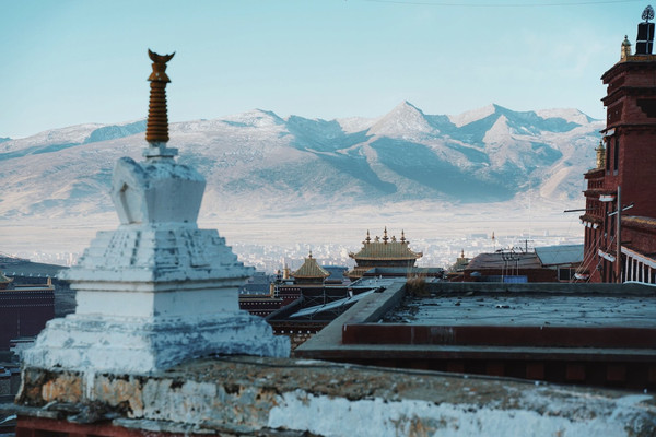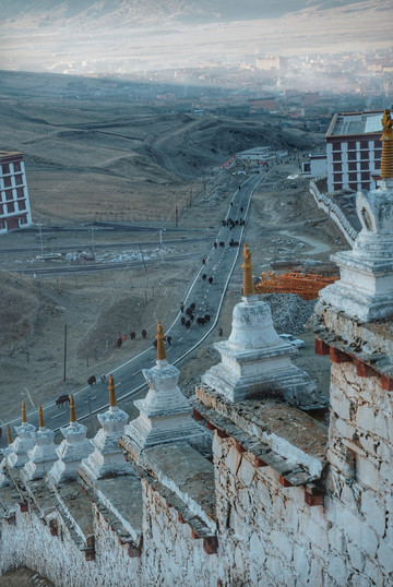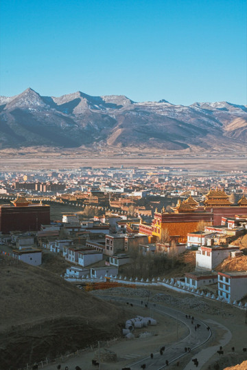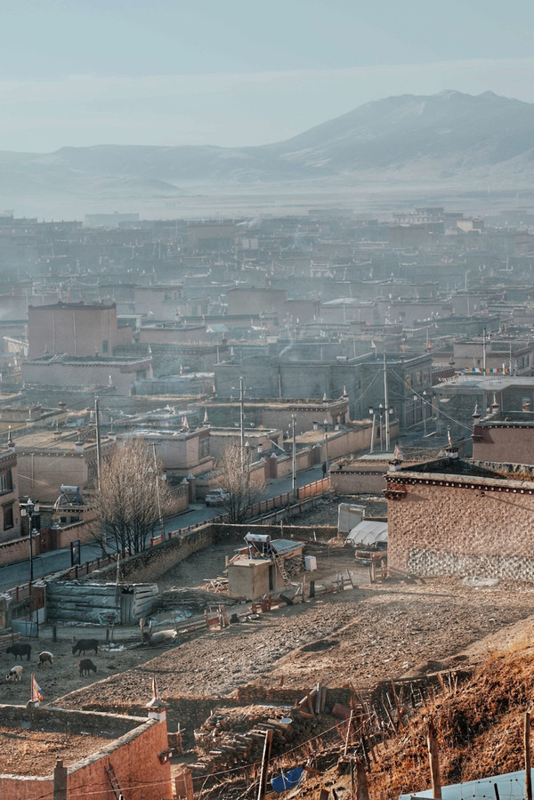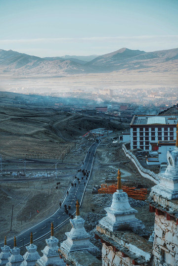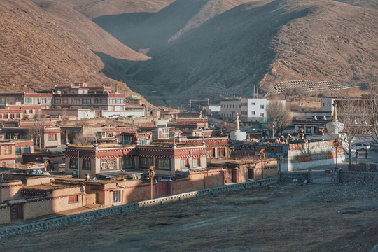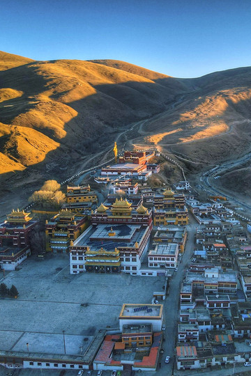 走走停停也终于到达了位于长青春科尔寺后山坡的顶部了,视野尚可,金色的晨光搭配着大片大片藏族特色建筑,一眼万年。