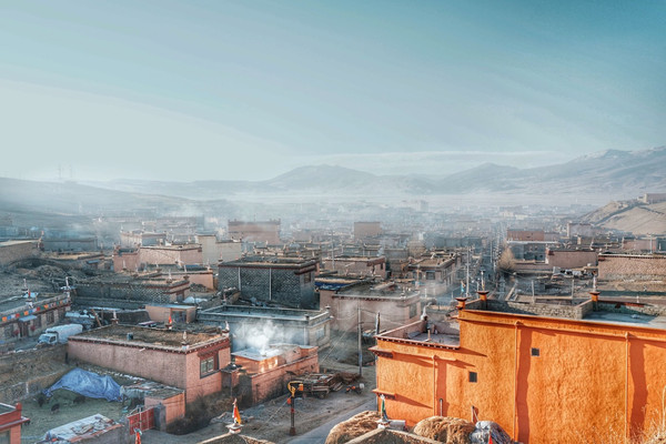 攀登过半,我们回过头看,马上被眼前这景致震撼了心灵。藏族特色的房子在晨光与迷雾中充满了神秘感,袅袅的炊烟又让整座城市有了生命力。啊,这就是我心中所向往的 理塘 。