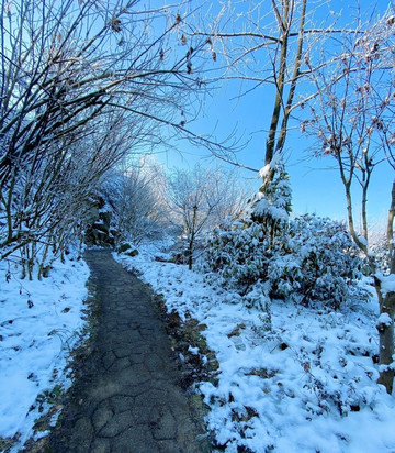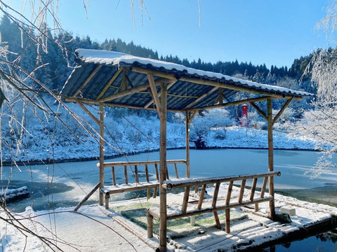 沿着步道往前行,雪花已经占领了眼前的风景,大地铺雪如被,人踩在厚雪之中,深一脚浅一脚的,却没有泥足深陷的烦恼,每一脚落下唯有期待,是玩雪童心缺憾被弥补的惊喜溢出,那雪地中深浅不一的脚印,尽是南方人对天地馈赠的美好事物的感动。红枫岭秋时赏红枫,冬日雪飘也能赏玉林雪枫。雪落有段时日,不少枫树都带白挂雪,雾凇冰挂争相挂在枝头。偶见昨日之红枫也已堆雪,虽不如秋日的红烈,却更显妖娆,另有一番魅力。看冰挂,尤以星空木屋旁的杨柳最为惊艳,垂落条条晶莹冰挂,虽失了绿意,却有股冰清玉洁的圣洁,美的让看的人心醉。