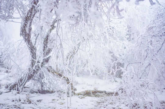 当原始森林披上一层厚厚的雾凇,怪树林仿佛蒙上了一层面纱,让怪树林充分的体现出了它的美,就像奇幻森林。