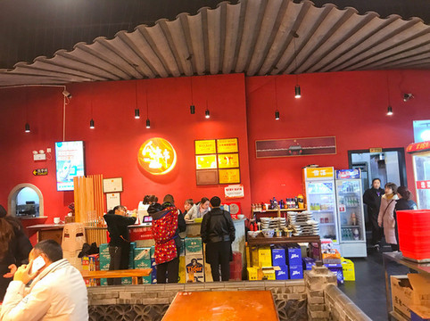 以红色为主调,木桌子木板凳,给人一种舒适感,场地宽敞,功能分区清晰,方便客人取菜就餐。