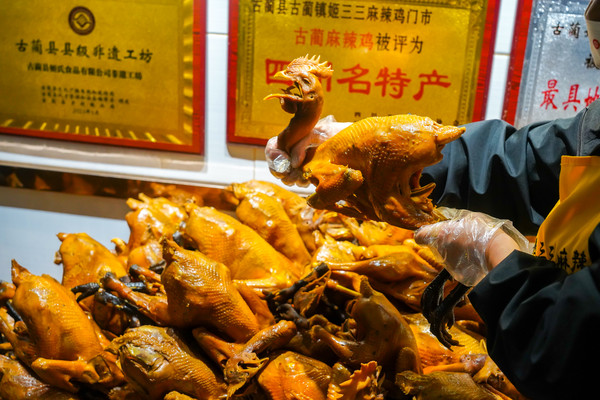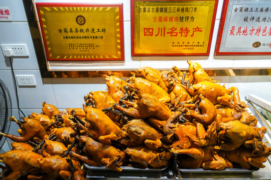 古蔺麻辣鸡是古蔺人祖祖辈辈研究出来的一种卤制小吃,精心挑选跑山土鸡作为原材料,再用多种中草药熬制的香料将鸡卤制,要求鸡肉脱骨,外表形状不变,成金黄色。在食用时,剁成小块,并拌以特制的以麻、辣为主的蘸料,先卤后蘸料,超美味。