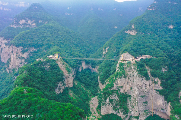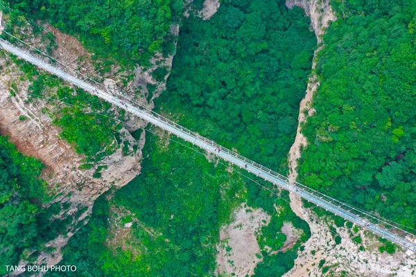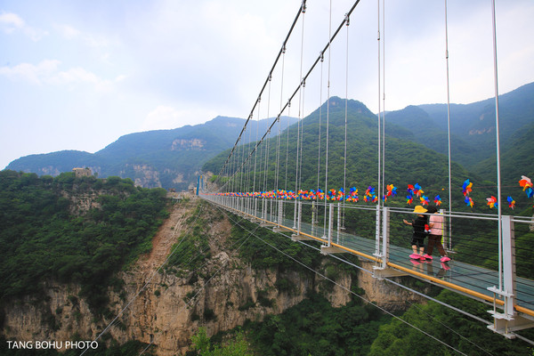 从玉皇顶下来后就要往鸳鸯桥方向下山,云丘山高空玻璃桥又叫鸳鸯桥,长度219米、高度195米、宽度2米,为目前山西省最长,最高的全透明高空玻璃桥。玻璃桥悬于云丘山两座巨峰之间,两峰崖壁陡直,中间裂谷横穿。风和日丽之时,踩在玻璃桥上,脚下峡谷裂隙尽收眼底,行走其上彷如御风而行,惊险无比。云深雾重之际,于桥上悬空赏景如漫步云端,如若“云中天桥”。