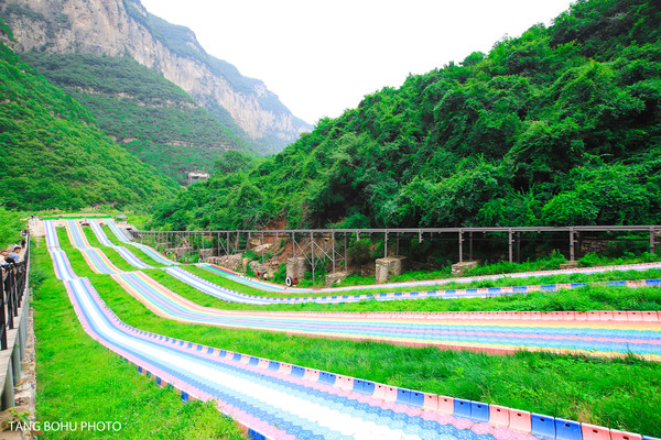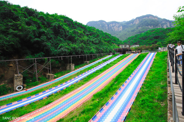 打卡完毕后继续往下走,会看到一个七彩的滑道旱地滑雪,像彩虹波浪一样向外延伸。从滑道上滑下去,跌宕起伏的,真是刺激。