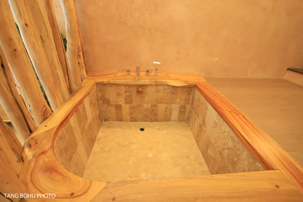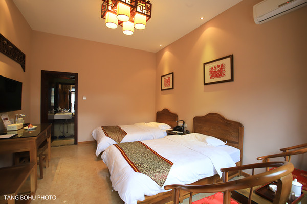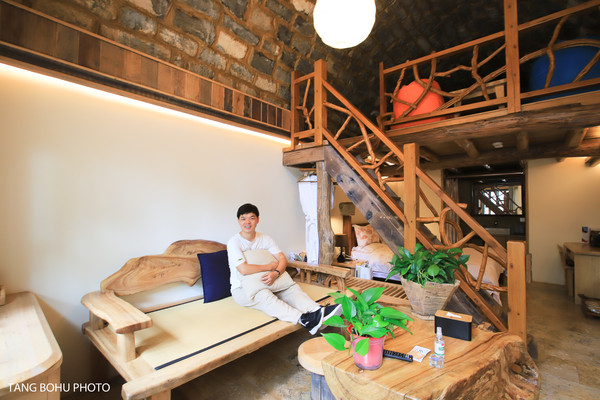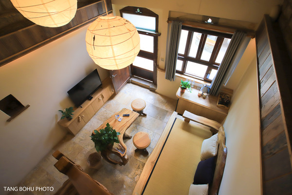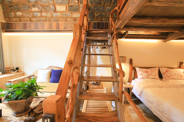 房间内空间宽敞、光线明亮,室内家具为实木打造、木材取自云丘山当地,体现出原汁原味的云丘特色。在保留本地民风的同时,更增添了完善的现代设施,以满足现代人对品质生活的多元需求,有一种归家般惬意的感受。房间里和普通的酒店差不多,但在第四层就不一样了,完全就是一个窑洞,每一层前面的大阳台上还有一些绿色植物和亭子。