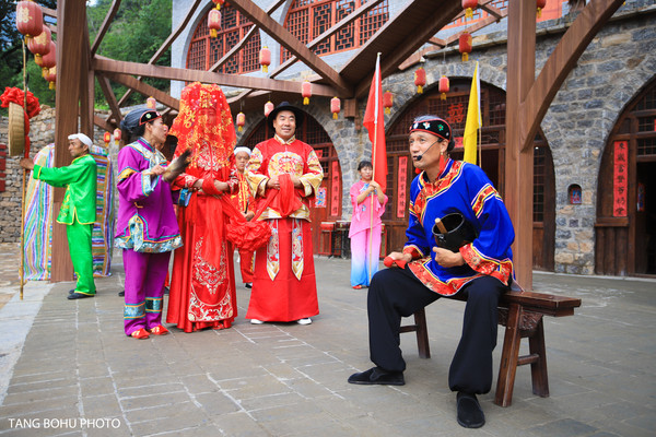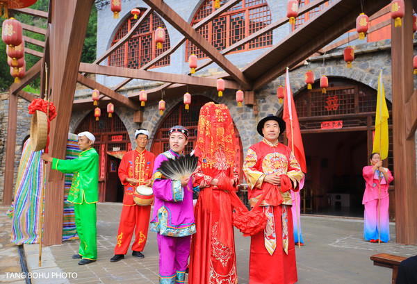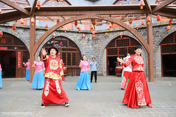在村子里远远就能听到敲锣打鼓的声音,我们来到村口,正好到了婚俗院的表演时间,届时正在上演着一对新人成婚时的礼节,满面的喜悦之情,甜美的歌声,淋漓尽致的把新人满满的幸福展现了出来。也让游客看到了当地婚礼的喜悦和幸福。