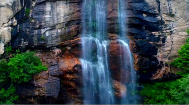 情侣瀑,位于日月峰下,下边两块巨石相依而卧,像是一对恋人促膝谈心,因而得名。传说情侣相携共饮此水,便可白头偕老,幸福一生。
