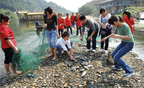 除此之外,还有踩水车,推石磨可以玩,还能在沙滩上自己烧烤或者是品尝当地美味的秋浦渔人竹筒饭。吃饱喝足后,在河湾里嬉戏捉鱼也是个不错的选择呀。