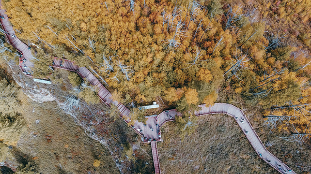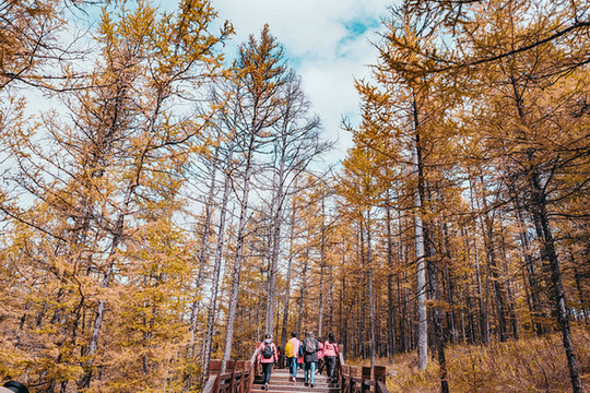 栈道不长,目前还有一小段没有完全修好,不过就更是增添了几分神秘的美,望过去颇有感觉。栈道上有一群中老年人在闲聊,一问得知,他们都是柴河镇的居民,每天早上会步行至此来锻炼身体。想来住在这恍若仙境的地方,呼吸着最清新自然的空气,对身体是大有好处的吧!不知是不是来的太早了,或者是这个季节来这里旅游的人太少了,全程除了我们俩,并没有看到其他游客!