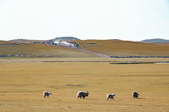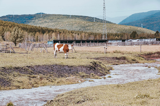 沿途我们观赏了各种各样的景致,因着初秋的降临,草和树都是一片金黄,几乎辨别不出二者颜色的区别,竟然真的有老牛在悠然吃草,不过牛老不老我不知道,这头牛的体积是真的大,他胖胖的身子时不时左右摇摆,尾巴也甩来甩去,尽职地做着着驱赶蚊蝇的工作,看起来格外悠闲。悠然的老牛,清澈的小溪,不知那放牛郎身在何处,整个画面倒是和谐的很。牛群们三三两两,这儿一堆,那儿一簇,不远处就是低矮的牛棚。
