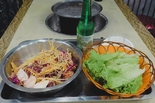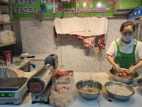 在网上看了很多推荐,几经对比,我们最后选择了马晓马家的烤肉,我发誓这是我吃过最好吃的烤肉了!没有之一!这里吃烤肉和我们平常吃烤肉很不一样,并不是你想吃什么点什么,而需要自己先到隔壁的肉店称好肉,这倒也是货真价实看得见,称好肉以后,店员会在肉里面放入各种调料将肉拌好,之后店员还会赠送几块牛油。这里的肉相对于我们其他地区来说,还是比较便宜的,我们割的牛肉是49块1斤。最后就是挑选蘸料了,可别小看这蘸料,拌肉和蘸料可是决定了齐齐哈尔烤肉的灵魂。支付费用时除了肉钱和蘸料钱还需要另外支付一个烤盘的费用,好像是25元。开烤前一定要用肥肉蹭一圈烤盘,香气四溢,等冒着香气的牛油块化了,我们就可以开烤了。