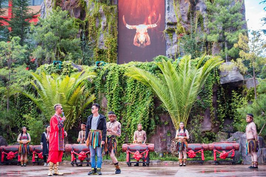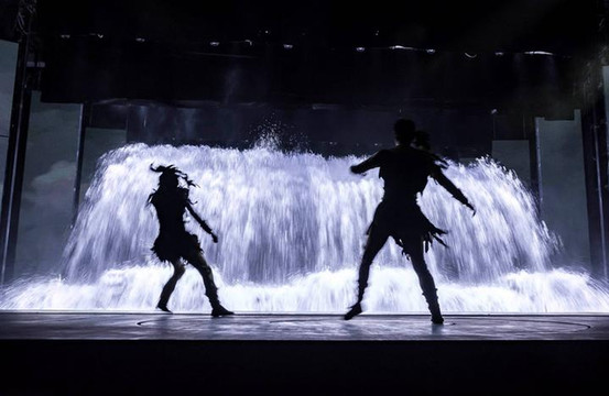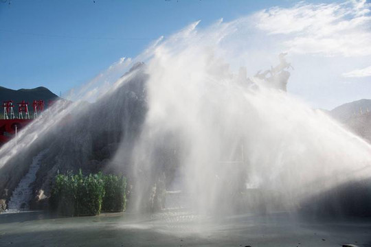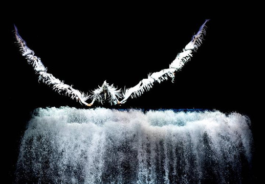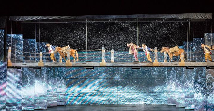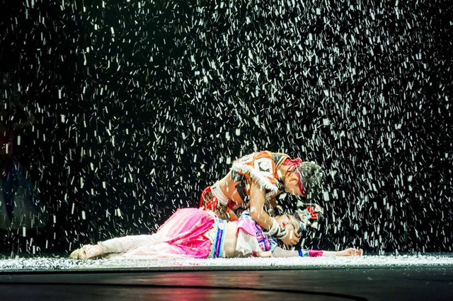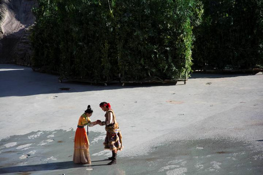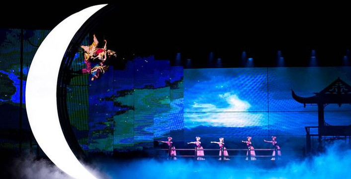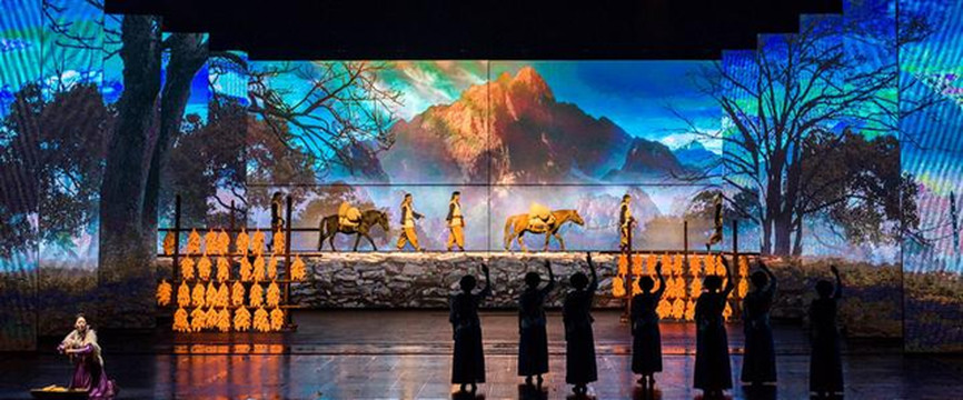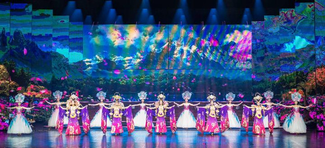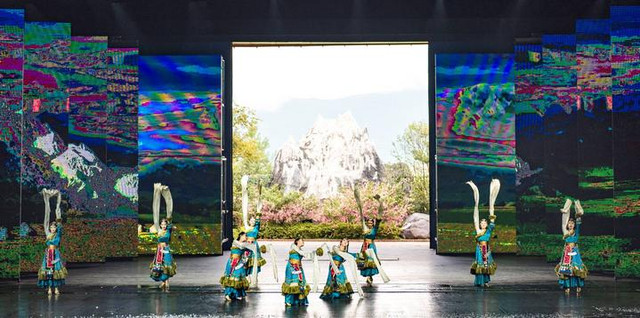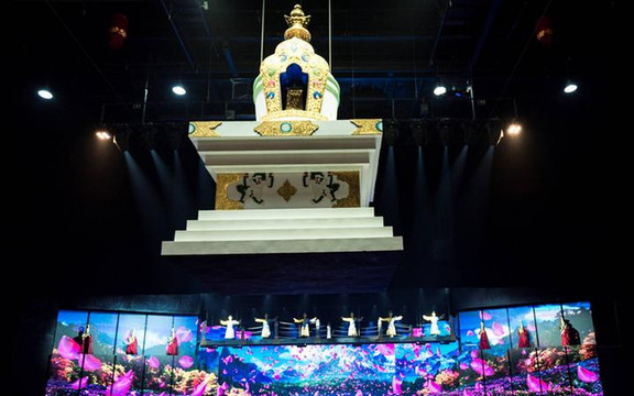 最震撼的有两幕:一是空中滑下的白塔,二是藏族歌舞表演时背后的雪山。当背景墙壁打开的一瞬间,外面的雪山与阳光投进来,当真是觉得神圣