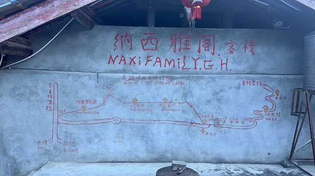 开车经过虎跳峡买票进景区的地点,然后道路左方有一条山路,开车10几分钟就到了纳西雅阁,其实这里就是一个客栈,不清楚的还以为是一个景点呢~~然后从纳西雅阁沿路往上走,就会看到茶马古道的石碑,徒步之旅就开始了。