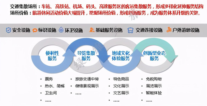 旅客体系和游客体系最大的差别在于游客有游览休闲消费的需求。因此如何在交通的设施结构中实现两个满足,一个是公共服务的满足,另一个是实现市场化收益性游客服务支撑。那么,如何有效的把旅客的服务体系向游客服务体系转变?首先是交通集散场所的转型,从安全有序的服务转型到多样化延伸服务,其次是旅游休闲活动价值大幅提升,通过挖掘场所价值,形成创新服务,成为服务体系升级的关键。
