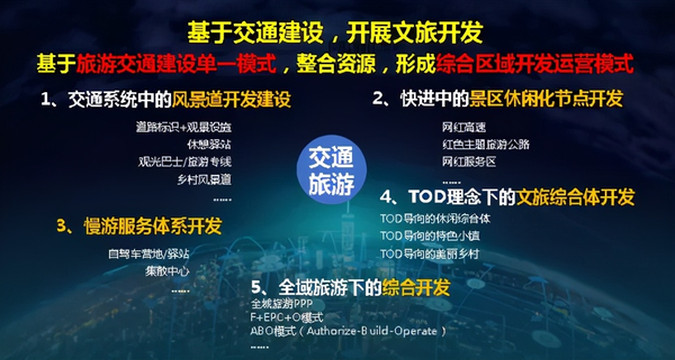 整个交通建设与旅游开发的关系,应该是用区域投资开发的理念整合交通旅游融合,形成交通旅游开发建设运营。近十年,有越来越多的交通企业运用区域综合开发模式。未来,交通枢纽、旅游目的地、综合体开发都可以运用区域综合开发结构,进行投融资整合。基于交通建设开展文旅开发,基于旅游交通建设的单一模式形成综合区域开发运营模式是整体思路。