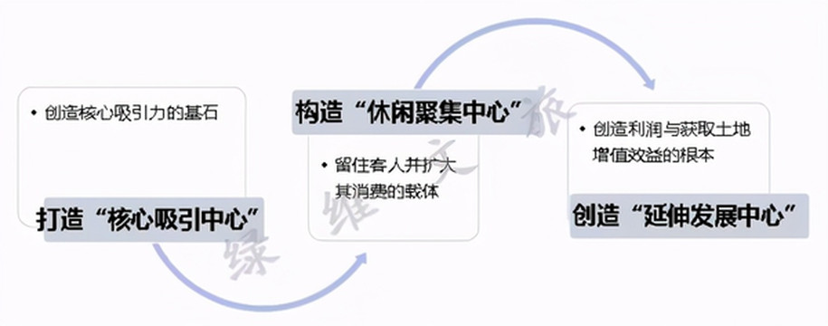 TOD理念下的文旅综合体开发从打造“核心吸引中心”、构造“休闲聚集中心”、创造“延伸发展中心”三层结构。以交通为引导核心需要形成聚集,从小聚集联动到大聚集,从带状开发到核心区域开发,核心区域开发难度最大,但是价值最高。
