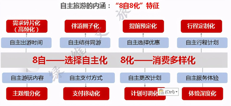 自主旅游时代是我在《全域旅游孵化器----自主旅游时代的全域旅游》中提出的一个概念,自主旅游是在移动互联和智能新技术支持下产生的由游客高度主导的新型旅游模式,“8 自”,即游客完全自主选择旅游时间、出游伙伴、出游方式、行程计划、游玩内容、支付方式、体验及更改计划;“8 化”,即自主旅游体现出碎片化、圈子化、预定化、定制化、细分化、移动化、可调化、深度化的消费特征。“8 自8 化”是在8 大“自主”方向上体现出的“8 化”特点,充分体现了游客多样,需求多元、个性、深度的趋势,这种趋势将促使市场细分和调整。