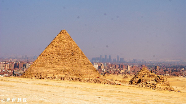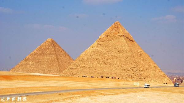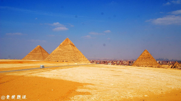 从金字塔底部驱车前往远处的一个高坡,这里可以俯瞰全部大金字塔,从右往左依次是门卡乌拉金字塔、海夫拉金字塔、胡夫金字塔,其它未完成或者塌陷的大多是王后金字塔,大大小小有十座。